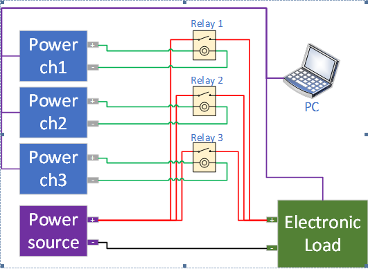 多組繼電器測試的設(shè)備連接方式如下圖表示,其中控制不同繼電器的電源可使用多通道電源設(shè)備來控制。