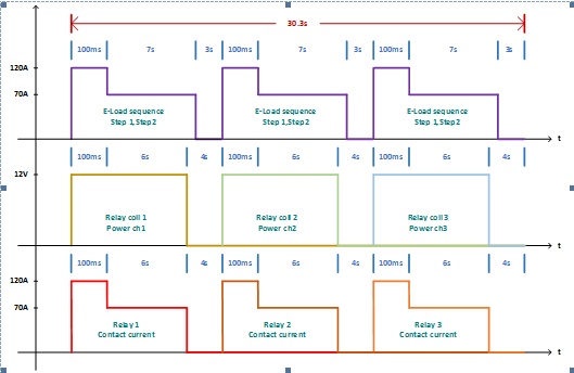 當(dāng)所有設(shè)備連接完成,并搭配計算機(jī)端的軟件控制,控制繼電器的通道、拉載電流等等…即可達(dá)到多組的測試需求,其實(shí)際動作波形可由下圖表示: