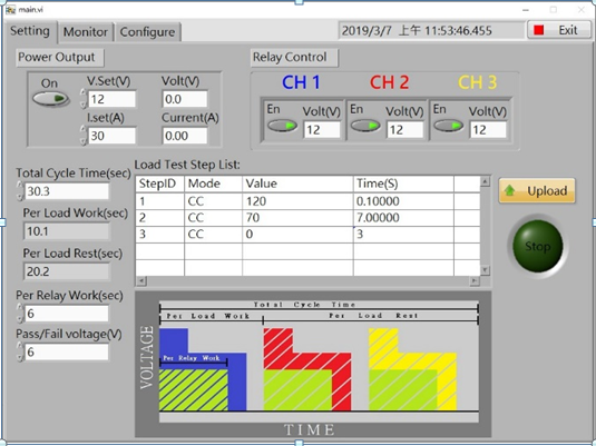 由客制的軟件需求撰寫出測試程序,可設(shè)定繼電器電流拉載的多組部階與循環(huán)次數(shù),可設(shè)定繼電器的拉載電壓與繼電器信道開關(guān),并可調(diào)整測試時序的時間,其接口可如下圖表示: