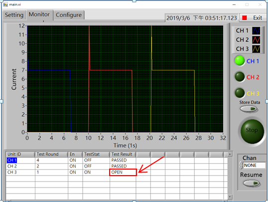 當(dāng)測試有異常時,程序會立即的停止測試并表示出異常的狀態(tài)為何? 那一顆繼電器的異常? 異常狀態(tài)為開路或者是短路?